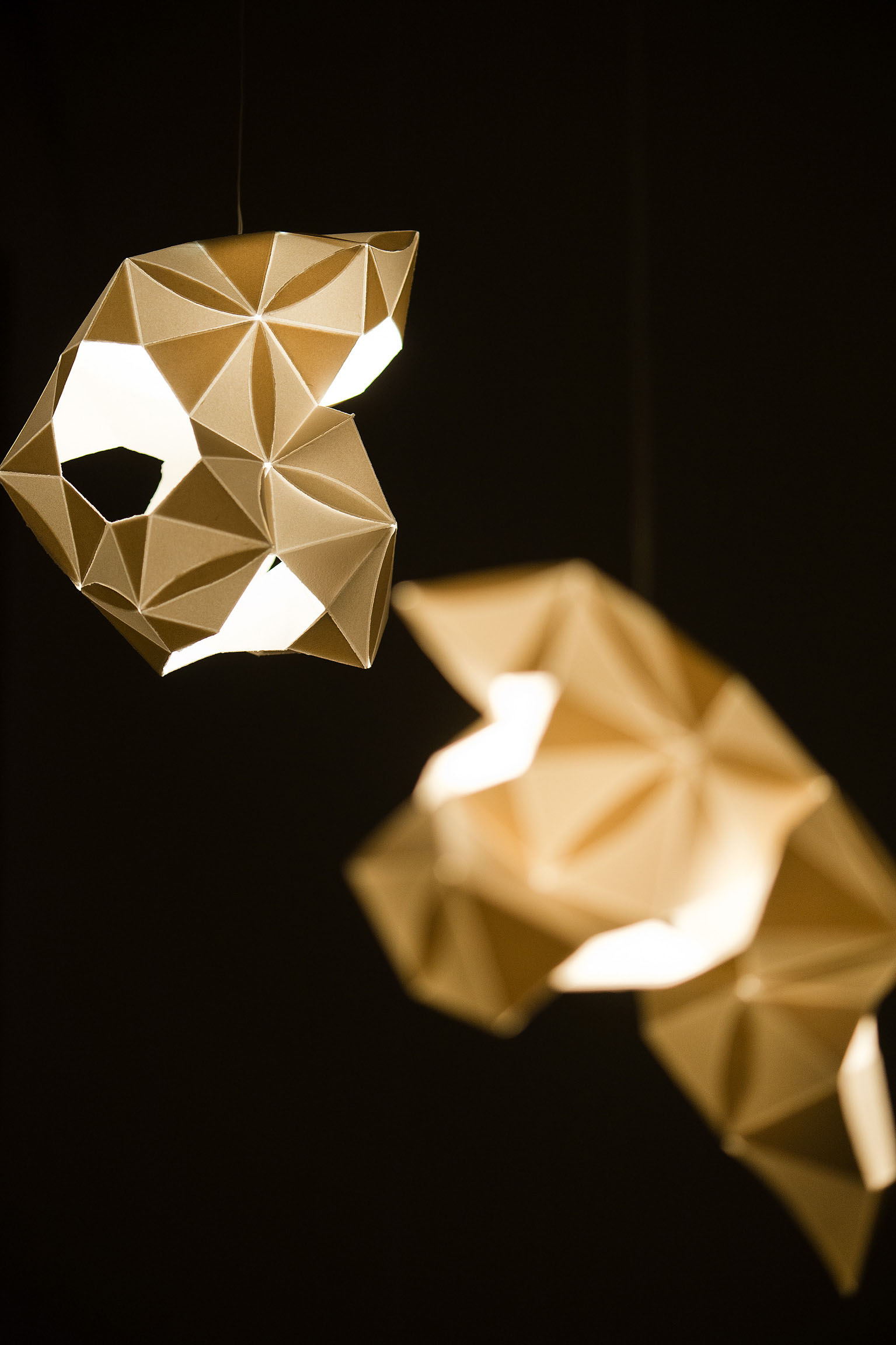 The objecs are based on structural elements made of hand-crafted paper, equipped with Osram's organic light-emitting diodes (OLEDs) and proximity sensors that simulated non-invasive energy absorption released by the proximity of visitors to the objects. The lighting situation thus varied with the frequency of visitors in the exhibition hall.